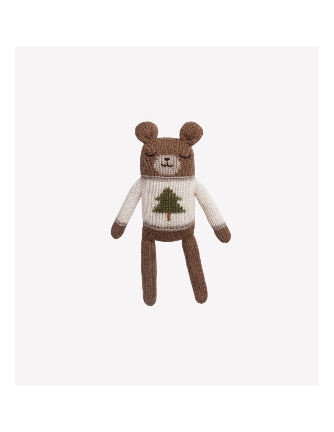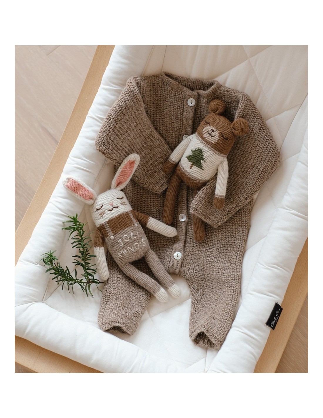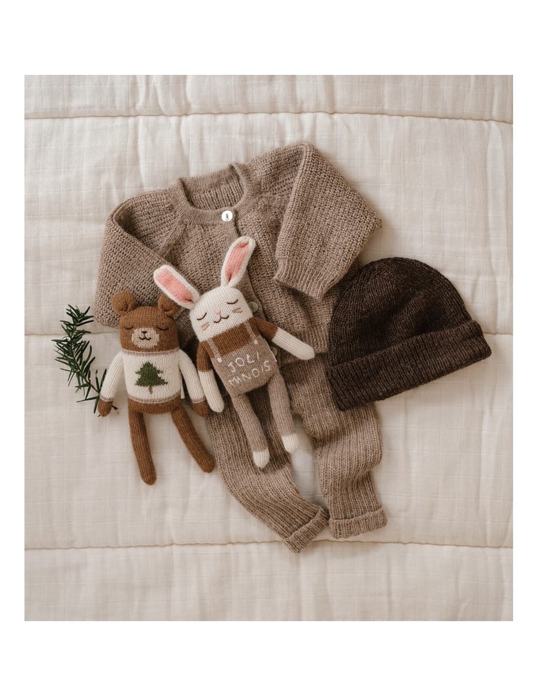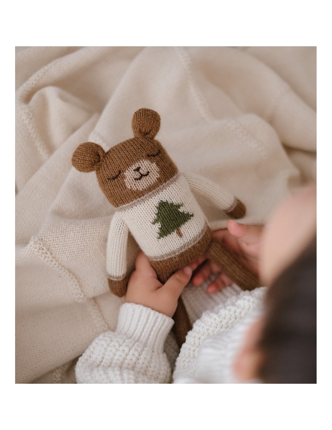 Notre petit ourson a rejoint l’équipe du Père Noël pour préparer les fêtes. Entre deux livraisons de cadeaux, il adore partager des câlins bien au chaud. Réalisé en pure laine baby alpaga, il est aussi doux que magique, parfaitement adapté aux peaux délicates des bébés.