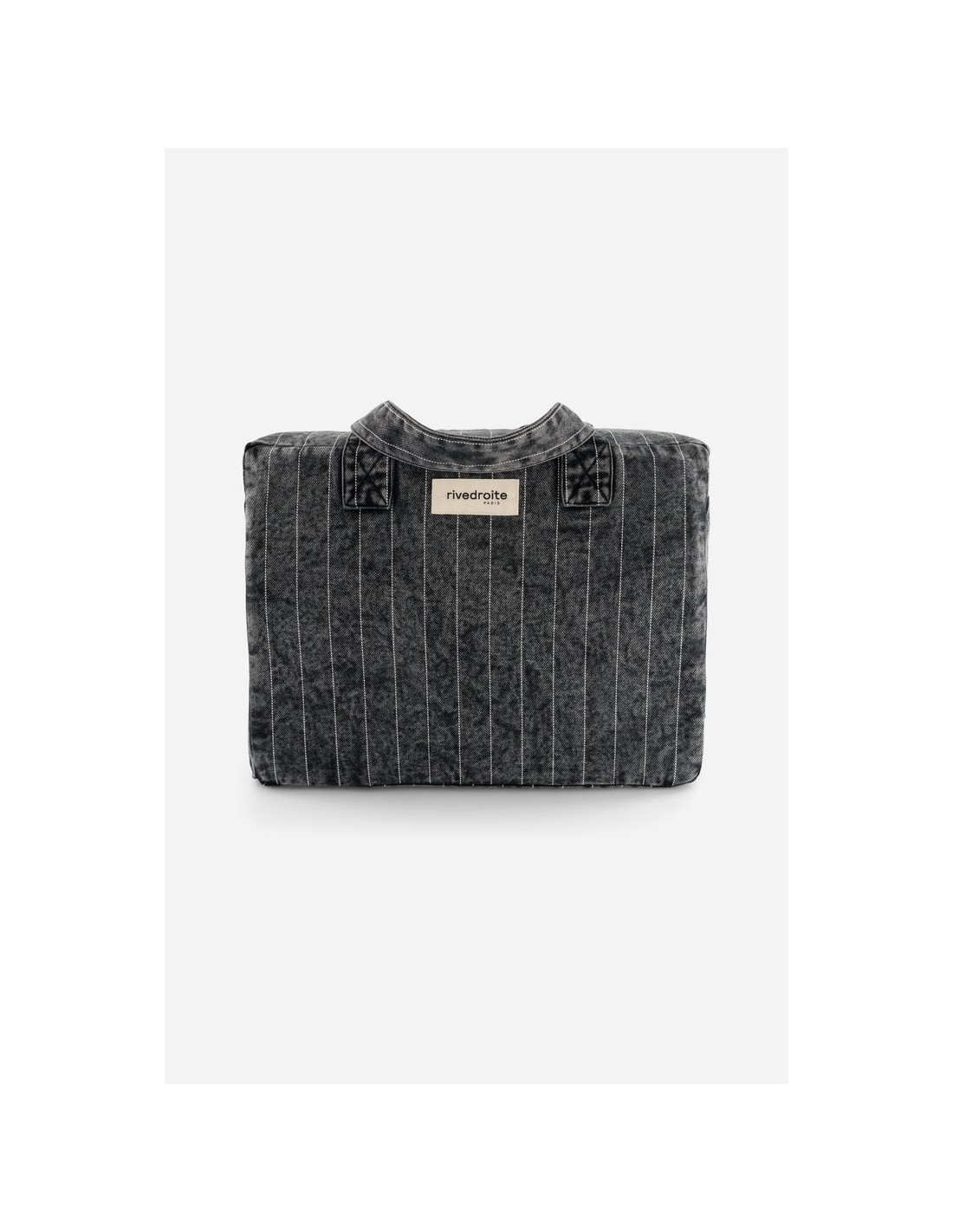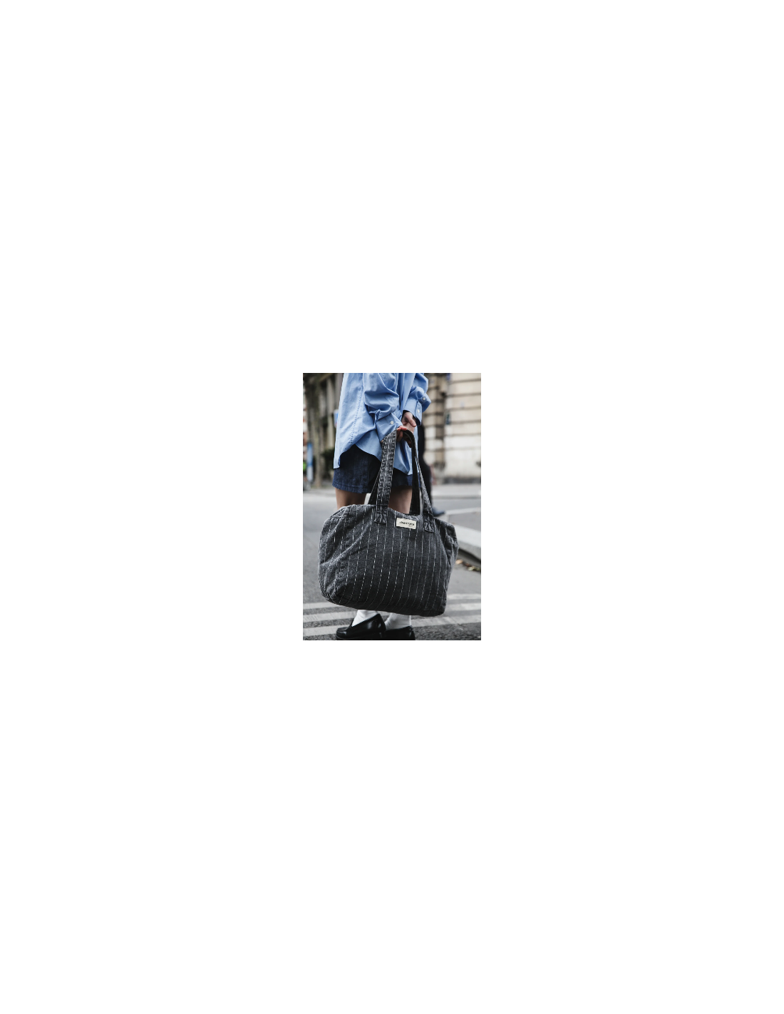Célestins le sac 24 heures se décline en version rayée, dans une toile de denim bleu délicatement patinée. Il est cousu puis délavé à la pièce, ce qui lui confère un look vintage inspiré des 90’s.