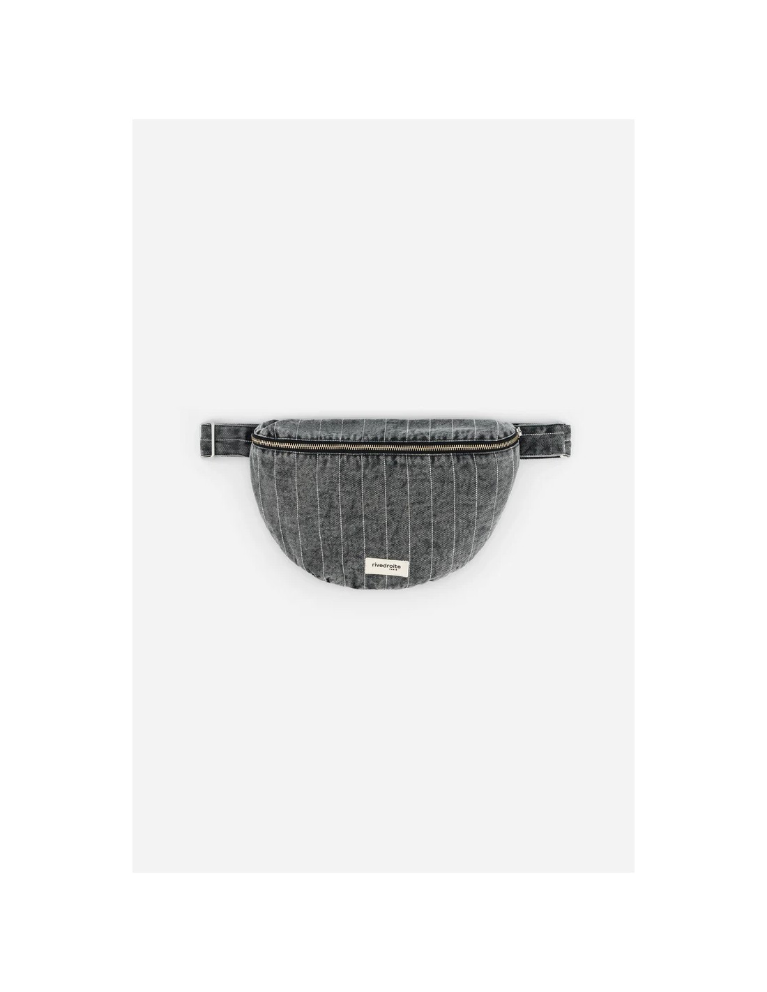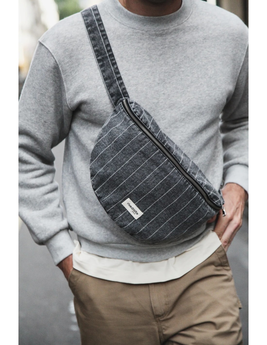 Notre iconique sac banane se décline en version rayée, dans une toile de denim noir, délicatement patinée. Elle est cousue puis délavée à la pièce, ce qui lui confère un look vintage inspiré des 90’s. Custine le grand sac banane, c’est la version XL de notre sac banane bestseller depuis 2017.