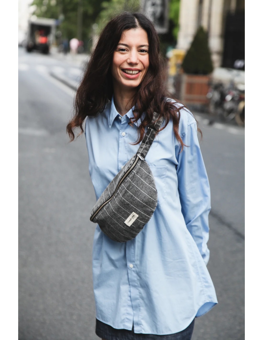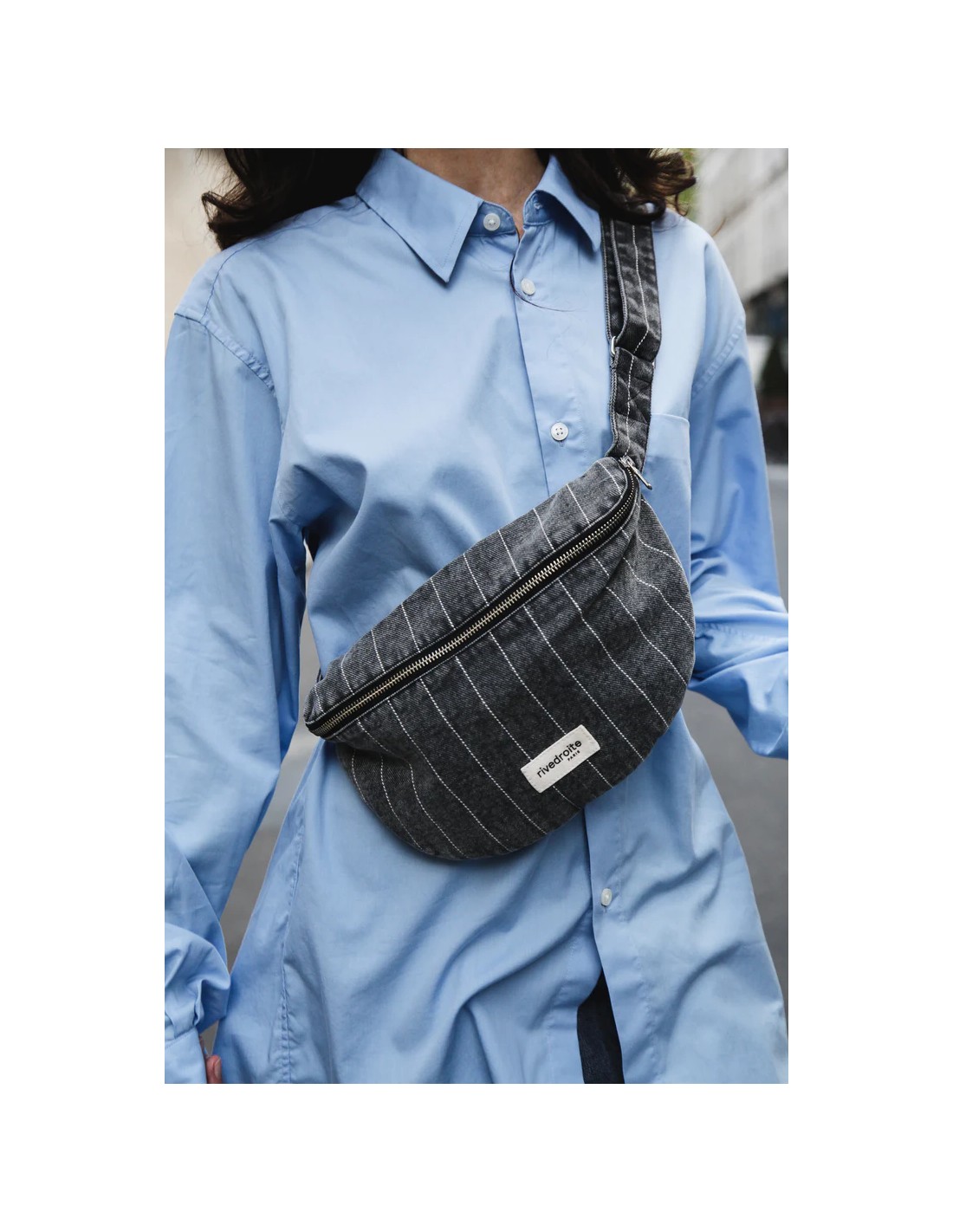 Notre iconique sac banane se décline en version rayée, dans une toile de denim bleu délicatement patinée. Elle est cousue puis délavée à la pièce, ce qui lui confère un look vintage inspiré des 90’s.