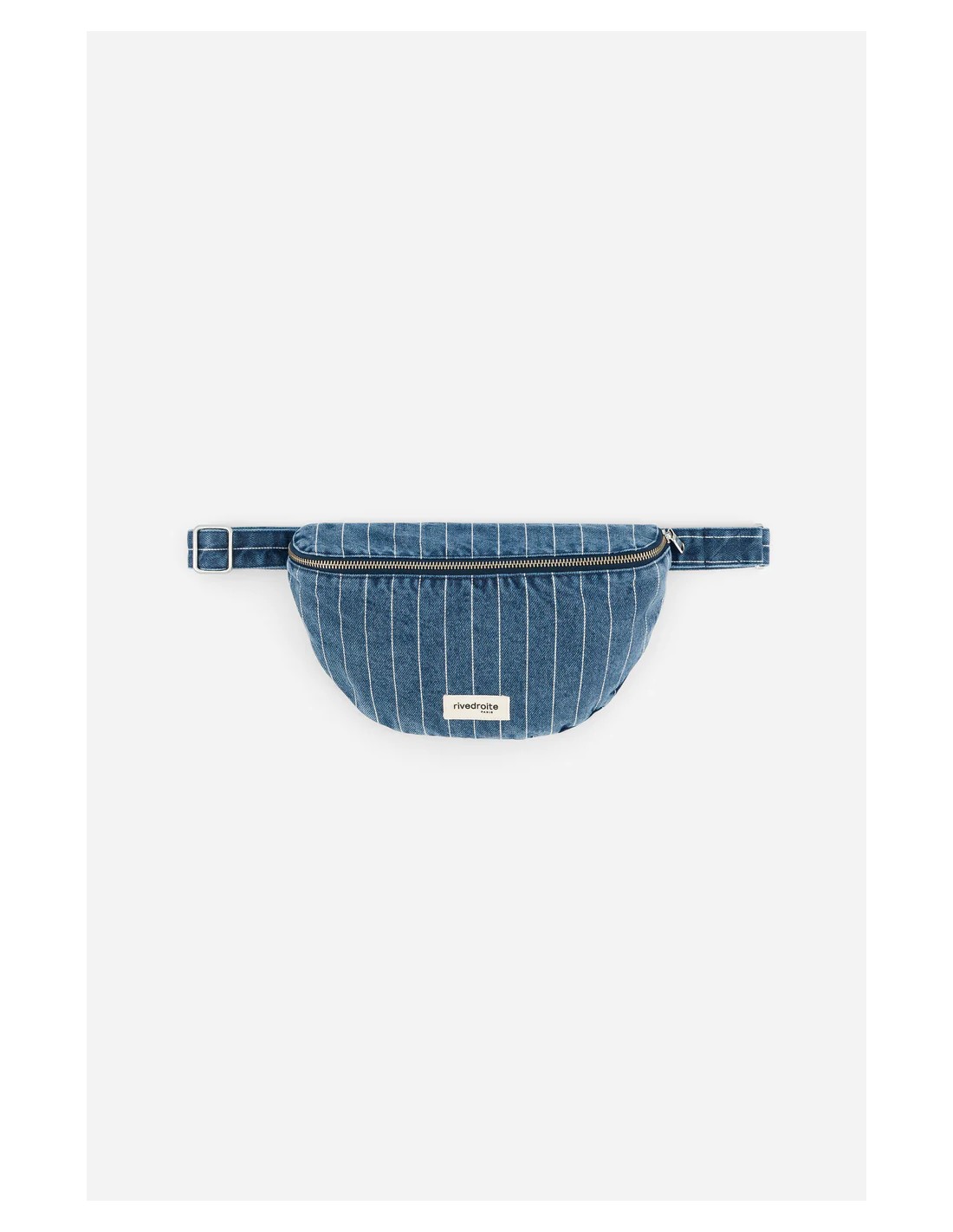 Notre iconique sac banane se décline en version rayée, dans une toile de denim bleu délicatement patinée. Elle est cousue puis délavée à la pièce, ce qui lui confère un look vintage inspiré des 90’s.