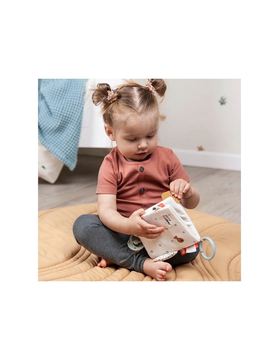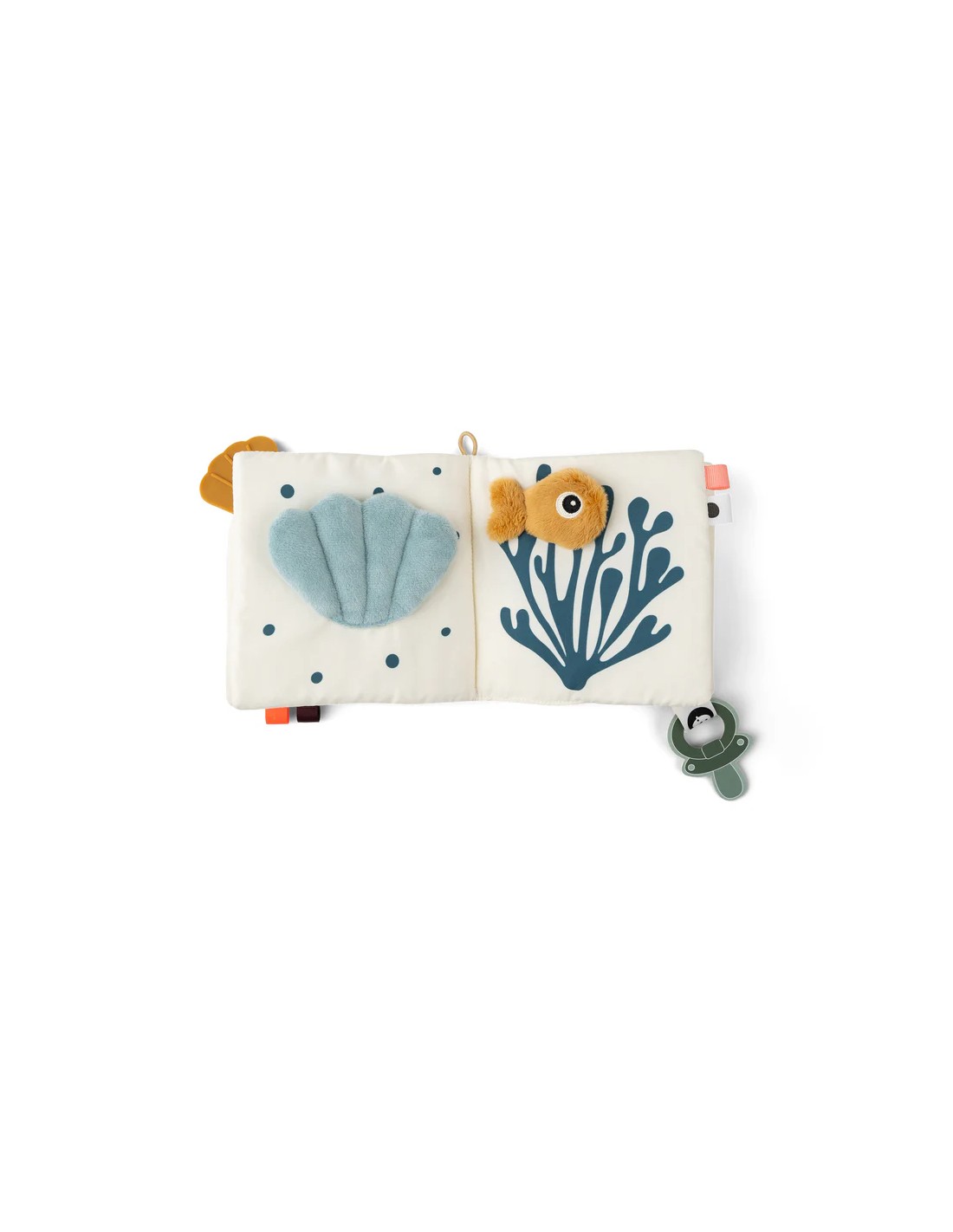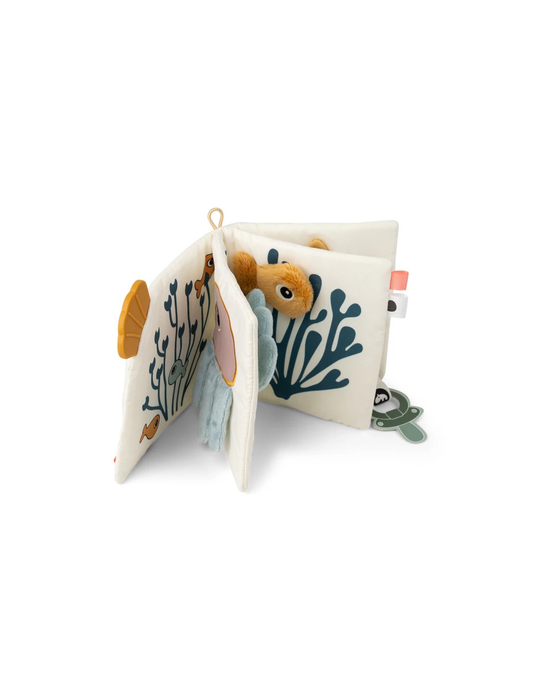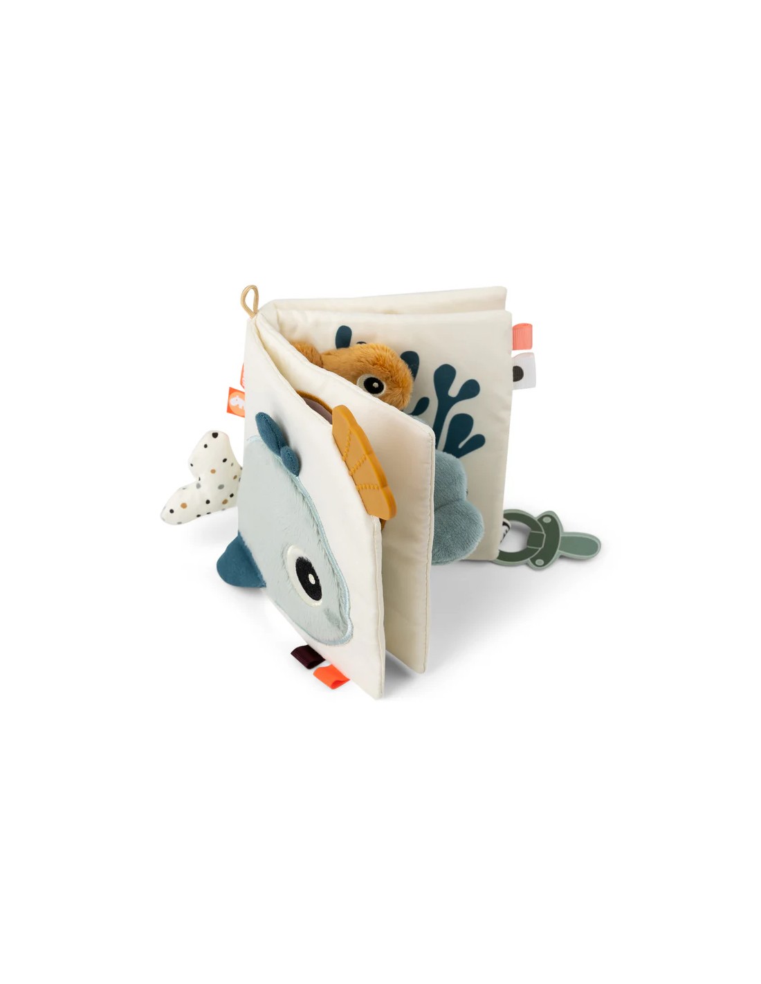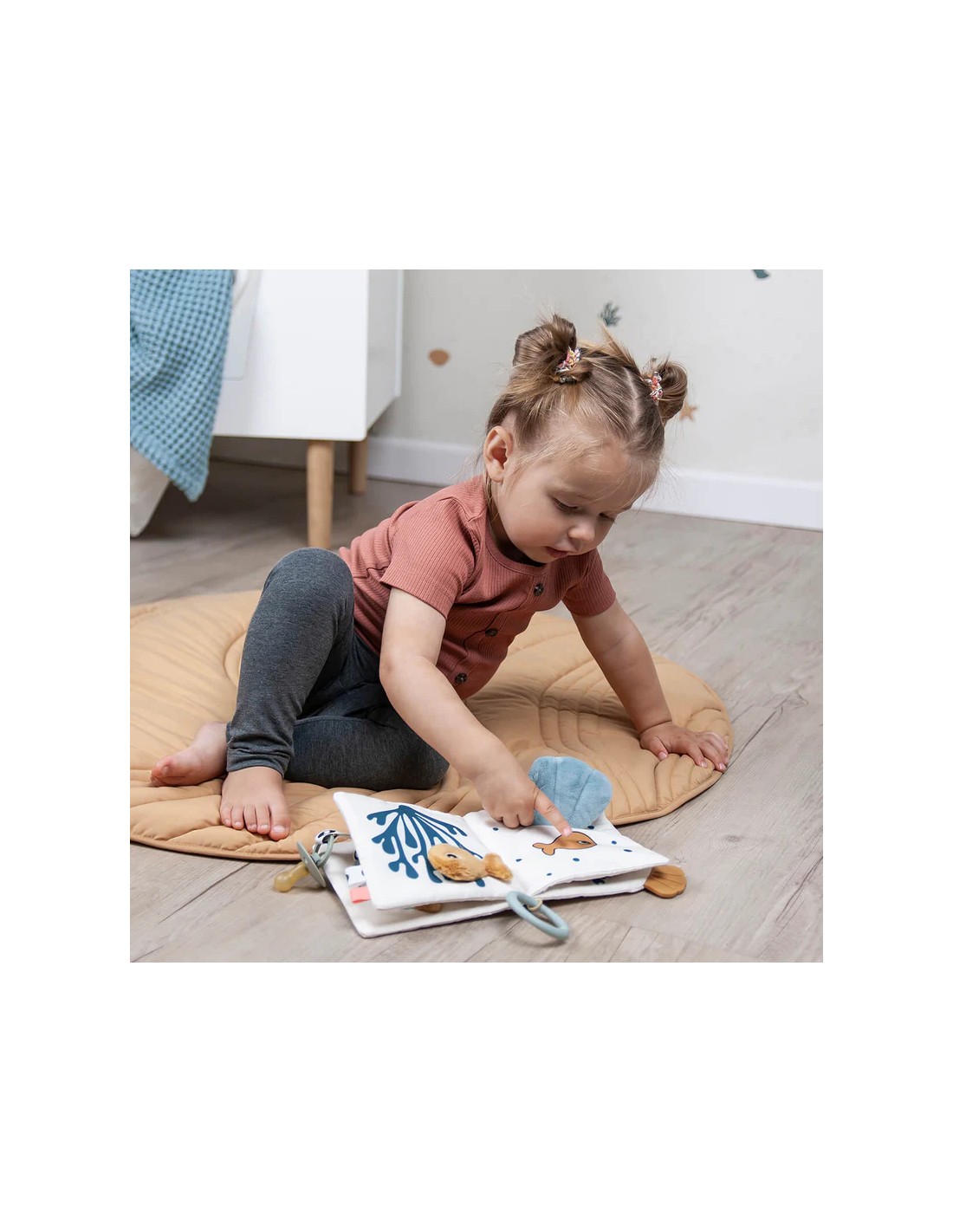 Le lien permet d'attacher le jouet à un tapis d'éveil pour l'heure du ventre ou à un siège auto pour les déplacements. Le livre d'activités souple est de couleur beige clair et présente un mélange ludique de créatures marines et d'éléments inspirés de l'océan de couleur Bleu, Moutarde/Rose.