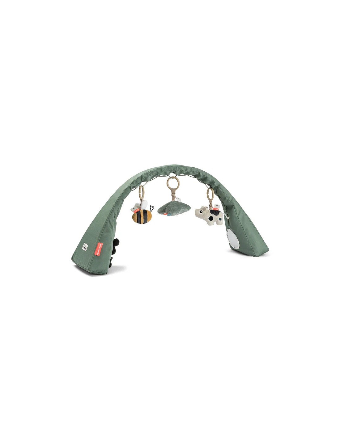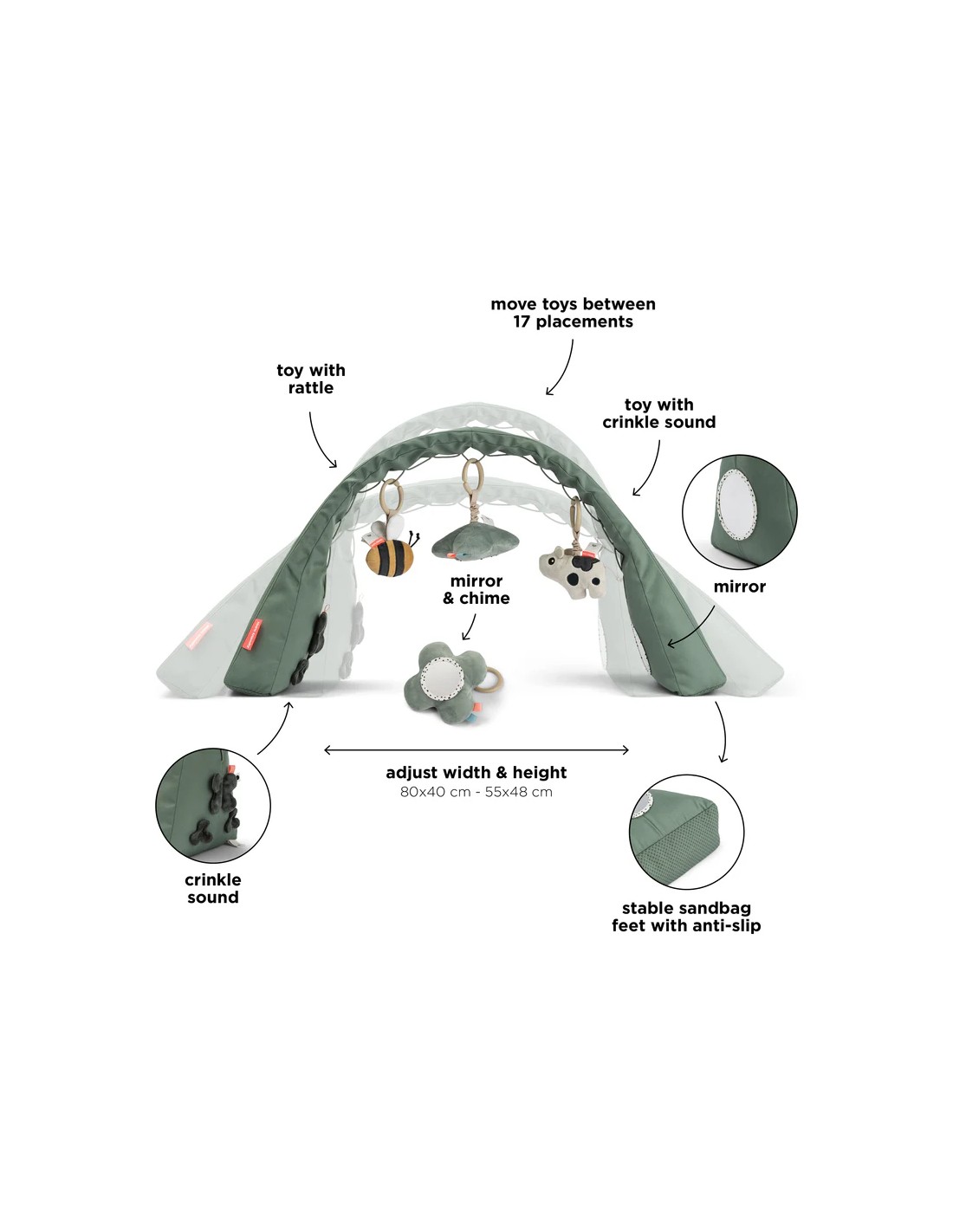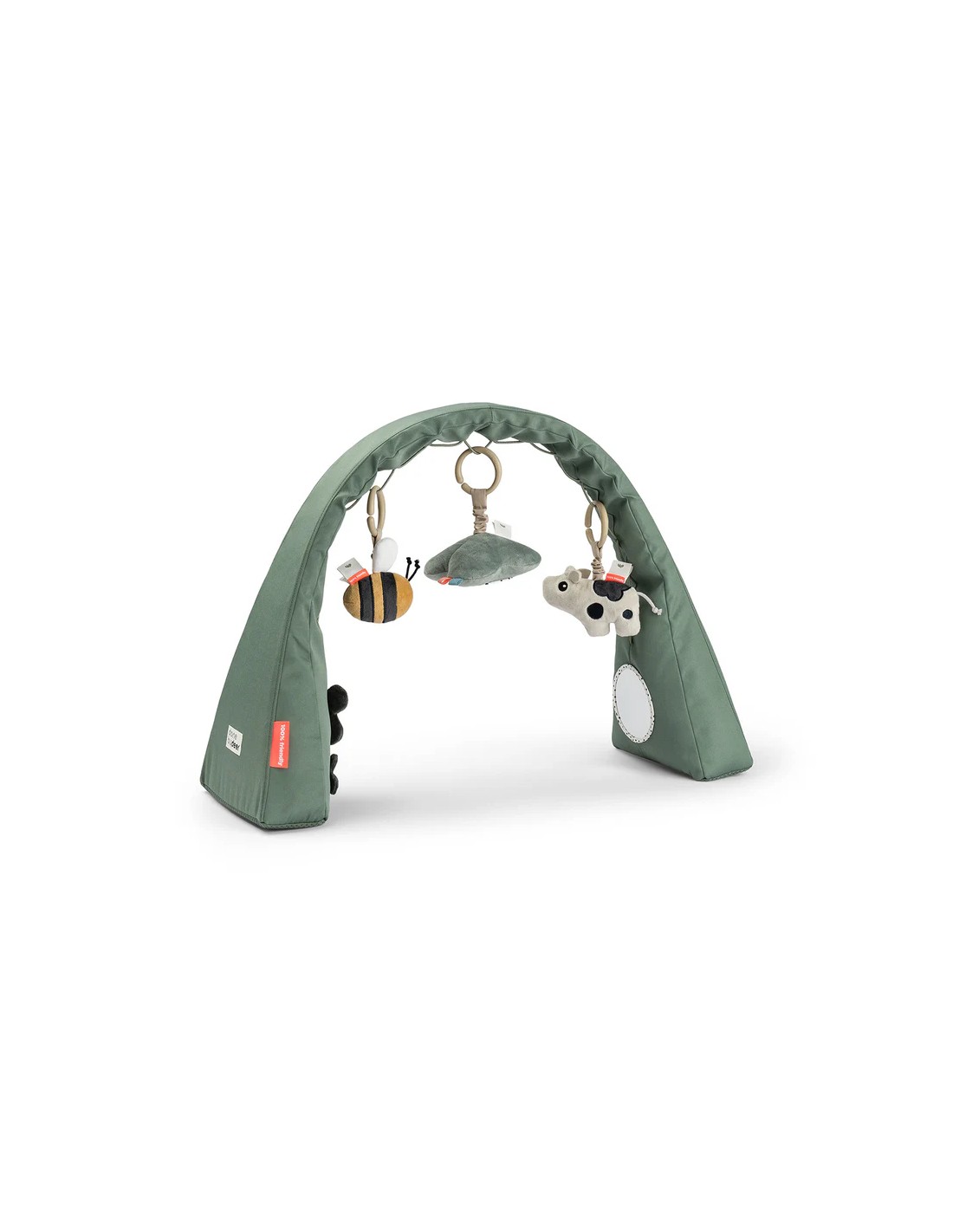 Cette arche d'activité verte stimule la coordination, développe la force corporelle et favorise l'éveil sensoriel de bébé. Elle s'utilise sur un tapis de jeu, au-dessus d'un nid douillet ou partout où votre bébé aime jouer.