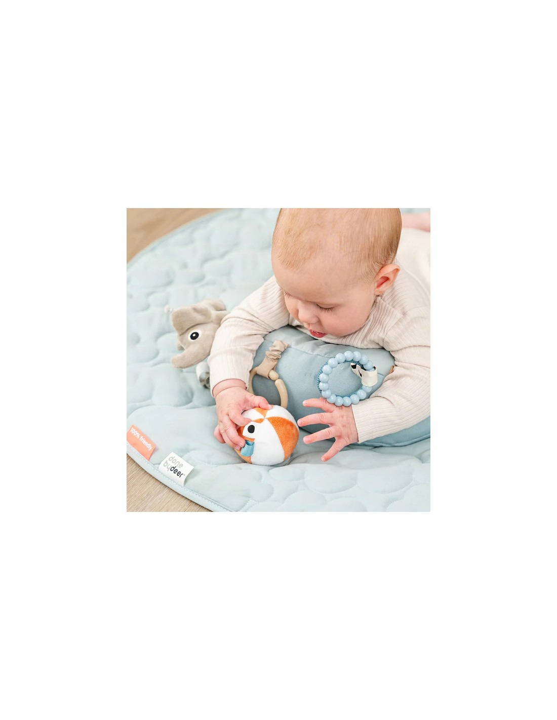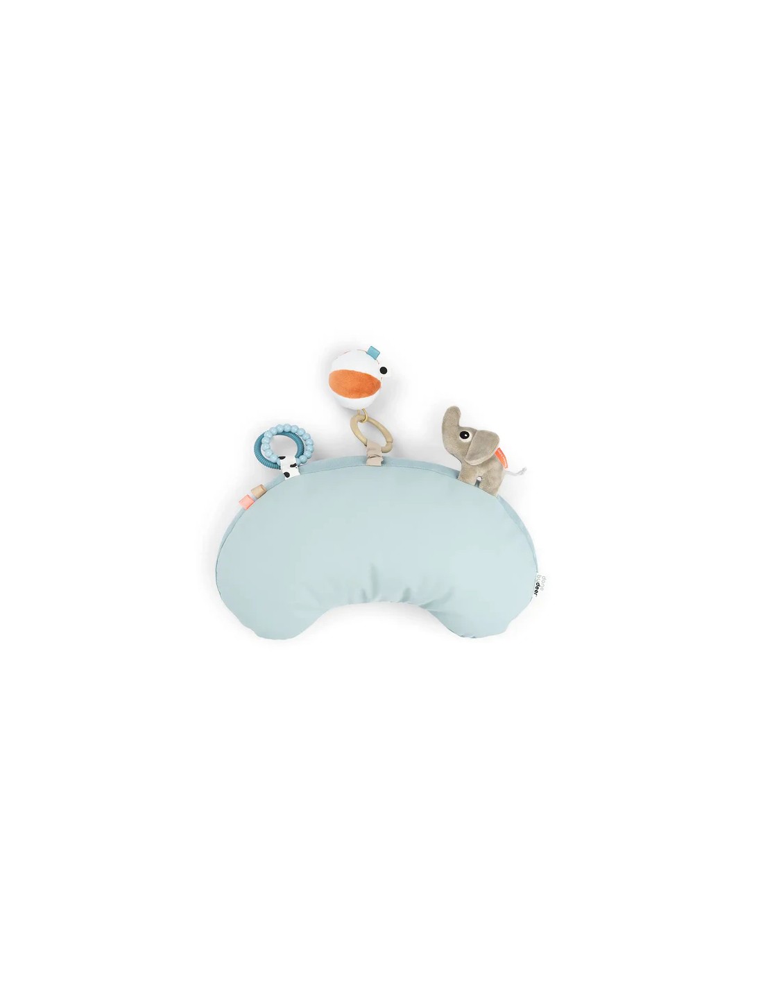 Les anneaux du coussin peuvent servir de anneaux de dentition pour soulager les gencives irritées, tandis que sa toile résistante et son dessus doux offrent un soutien délicat à la peau fragile de votre bébé. Avec ses jolies nuances de bleu et ses détails colorés, il stimule la vue, tandis qu'Elphee et les jouets intégrés divertissent votre tout-petit pendant sa croissance.