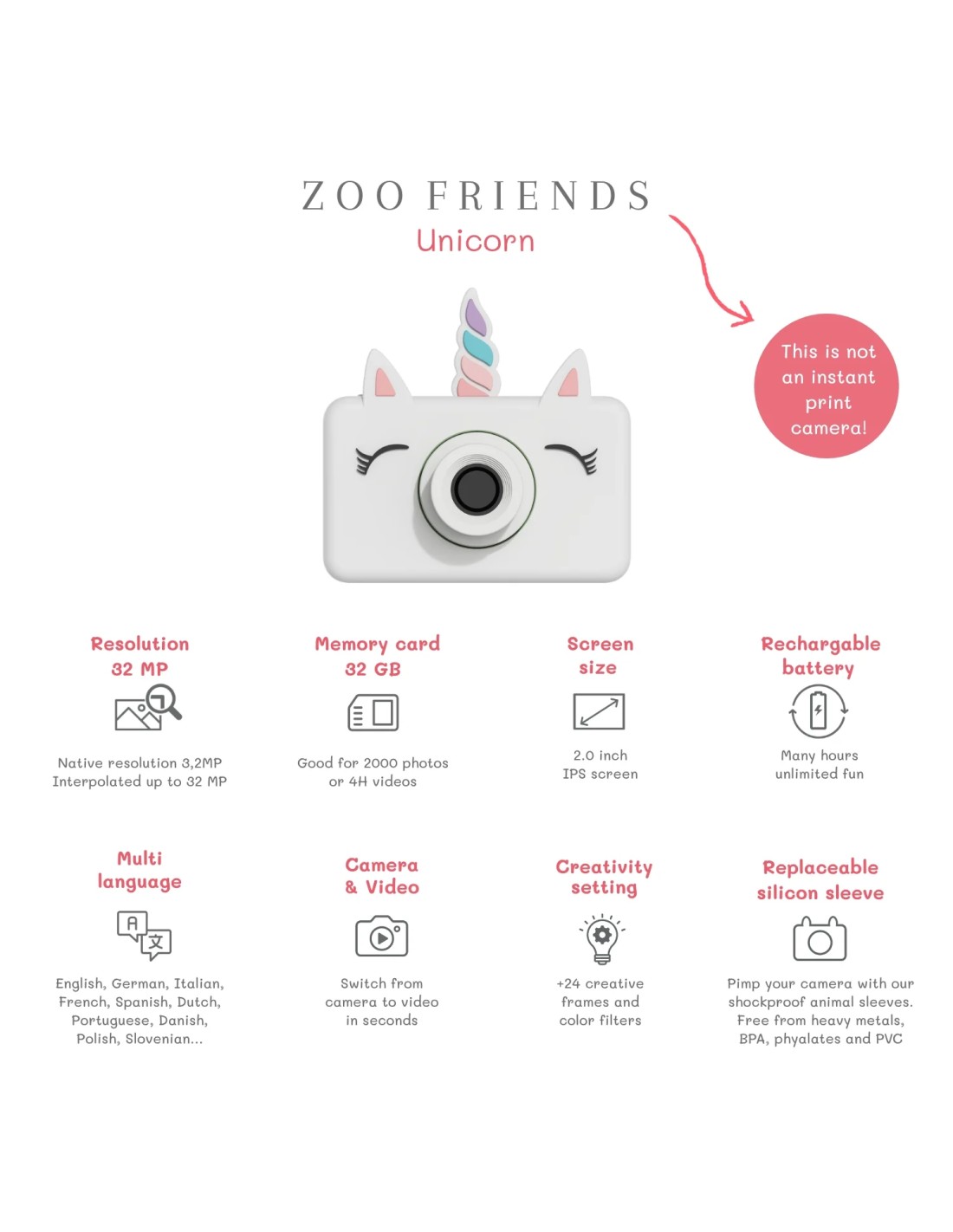 Cet appareil photo numérique de 32 mégapixels pour enfants au design d'une licorne et enregistreur vidéo de The Zoofamily est extrêmement mignon, petit et léger. Personnalisez l'appareil photo pour les enfants avec des autocollants et même avec plus de 20 filtres et cadres numériques.