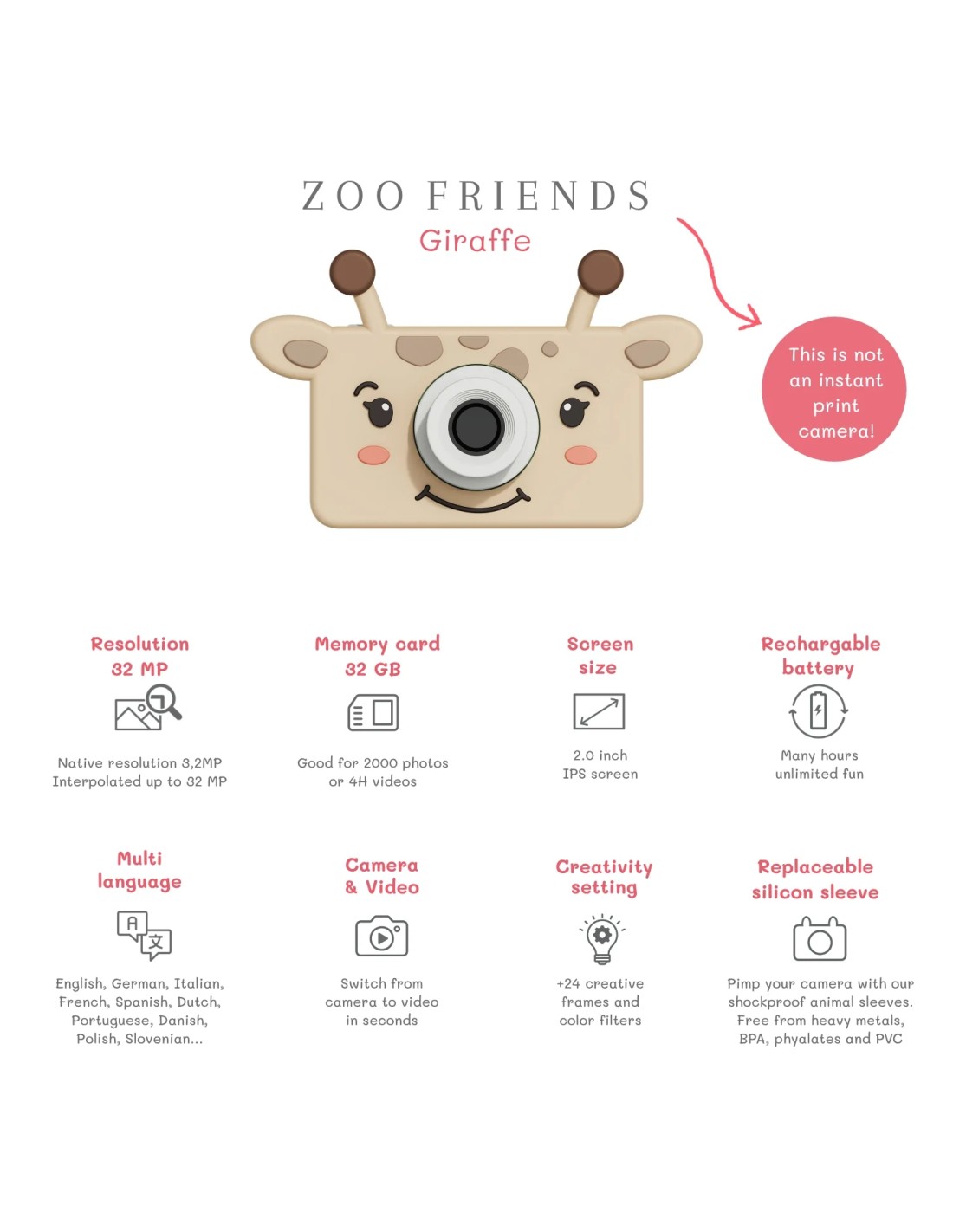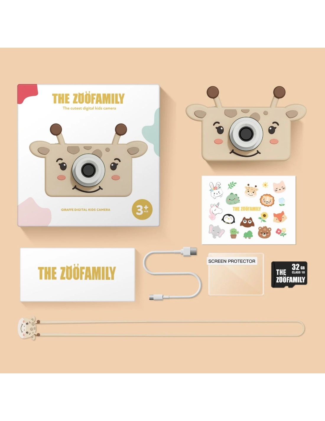Voici l'appareil photo et le magnétoscope numériques 32 mégapixels de Zoofamily, conçus par une girafe ! Cet appareil photo est compact, léger et idéal pour les petites mains. Personnalisez l'appareil photo de votre enfant avec des autocollants et découvrez une variété de plus de 20 filtres et cadres pour une exploration créative sans fin.